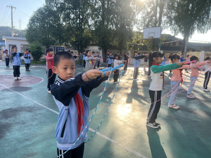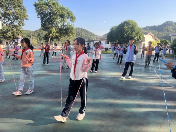 花样跳绳,是忠山小学多年来倾力打造的一张特色“名片”。学校虽小,却始终坚持“小而精、精而特”的育人理念。从基础的并脚跳、开合跳,到进阶的交叉跳、双人交互跳,再到集体协作的“8”字穿梭跳,在老师的带领下,全校学生利用课间十分钟、课后延时服务的碎片时间,反复打磨每一个动作。一根跳绳,串起了日常的刻苦训练、课间的欢声笑语,也舞出了这所乡村小学独特的精气神。