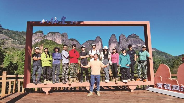 范思斌(前一)带领的徒步团队打卡大龙乡八仙崖。