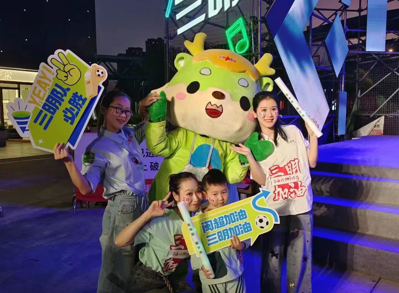随着夜幕的降临,球迷们陆续赶来,场上的座位很快就坐满,周围也站满了驻足观赛的市民。现场的球迷们身贴“三明 加油”的贴纸,手中挥舞着手拍、荧光棒,脸上满是期待与热忱。灵动可爱的三明城市吉祥物也惊喜现身,与大家击掌互动、合影留念,一同为三明队加油喝彩。